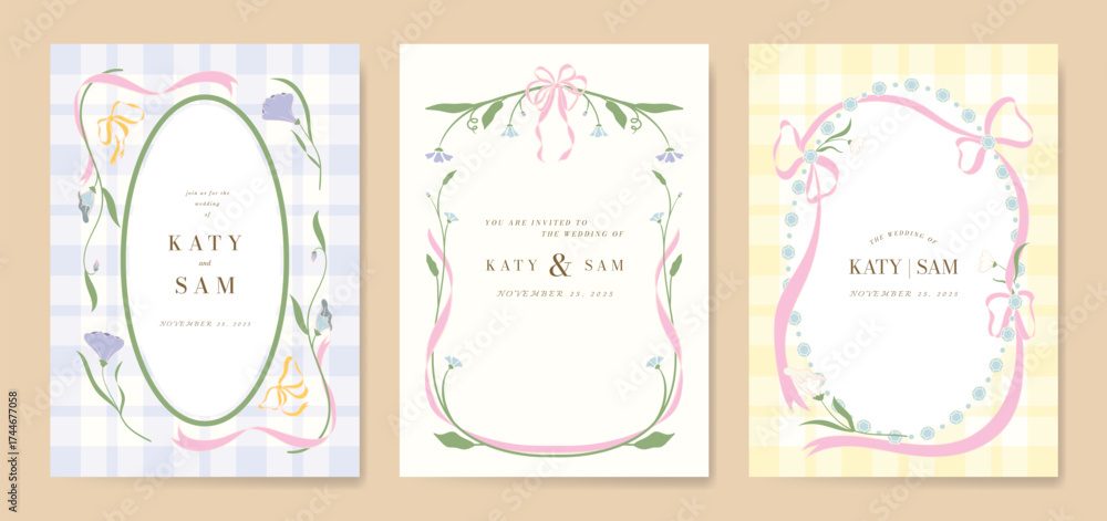 Fototapeta na wymiar - Wedding invitation card background vector set. Minimal hand drawn ribbon frame and flower. Design for wedding, vip cover template, rsvp modern card, poster..