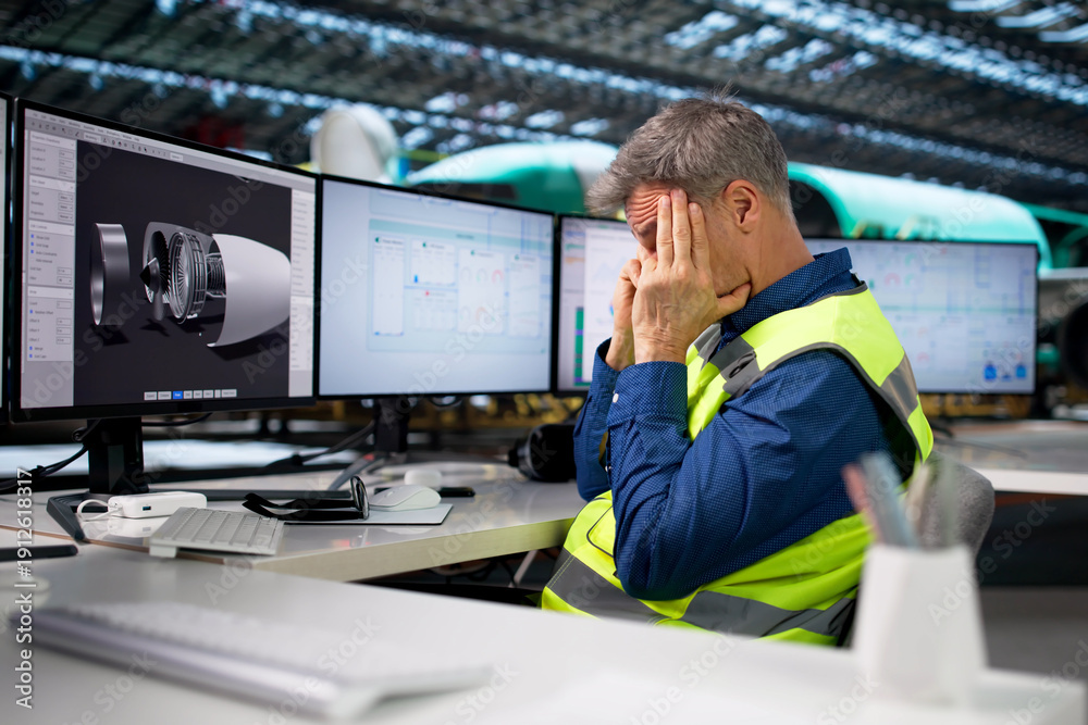 Fototapeta na wymiar - Troubled Engineer Struggling At Aircraft Factory, Stressed.