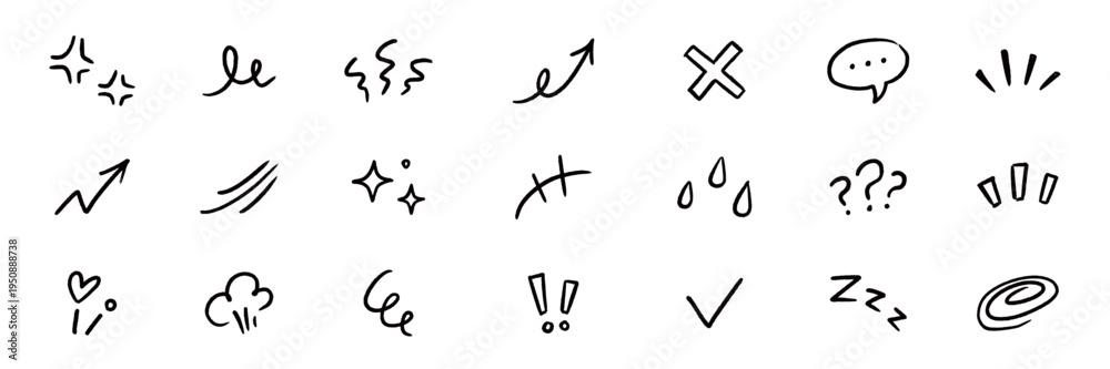 >Fototapety na wymiar>Wybrane dla Ciebie>Line element movement hand drawn set. Hand drawn sketch line element icon brush pencil stroke movement chalk. Cute comic cartoon emoji bubble heart star sparkle expression manga. Vector illustration