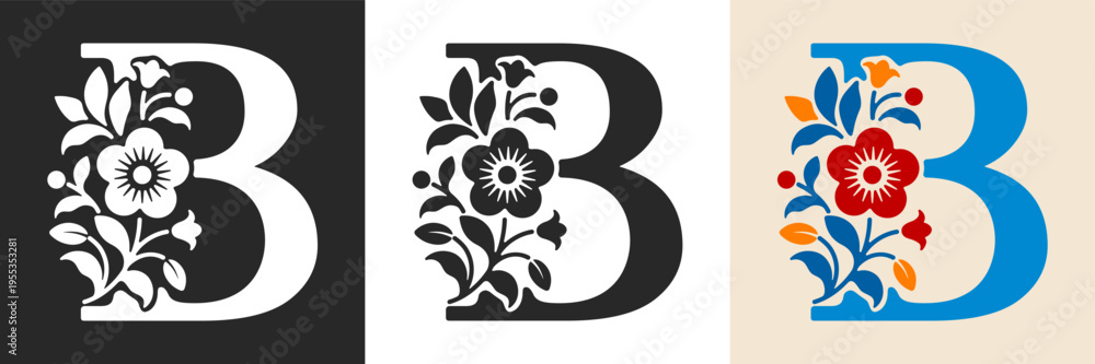 >Fototapety na wymiar>Wybrane dla Ciebie>Capital letter B with floral pattern. Letter A with flowers and leaves. Creative alphabet and decorated typography letter. Vintage patterned font. Isolated on white and black. Vector illustration