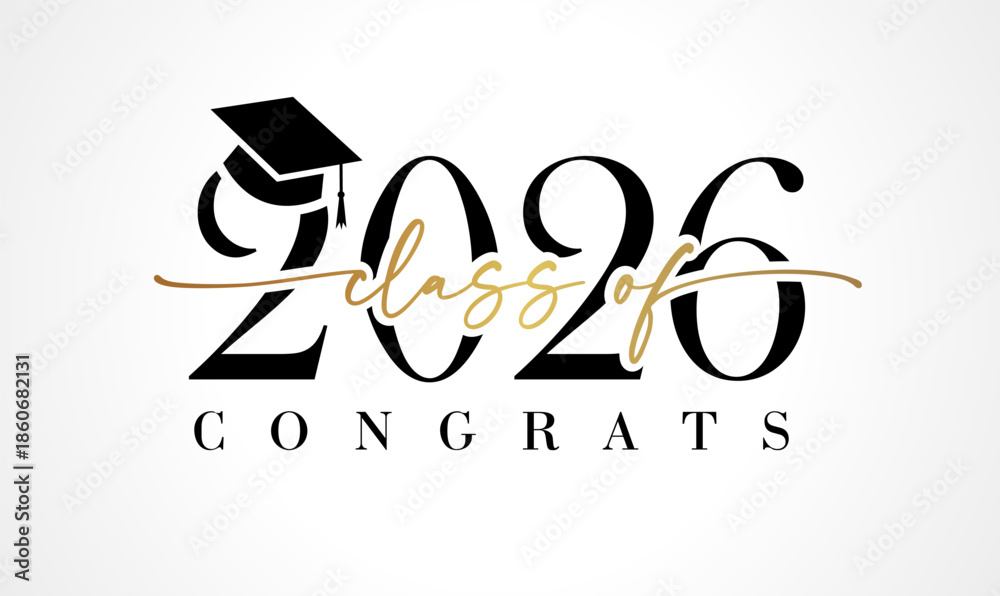Fototapeta na wymiar - Class of 2026 calligraphy banner. Congrats graduation class of 2026 with academic cap. Vector design for booth in high school or college party.