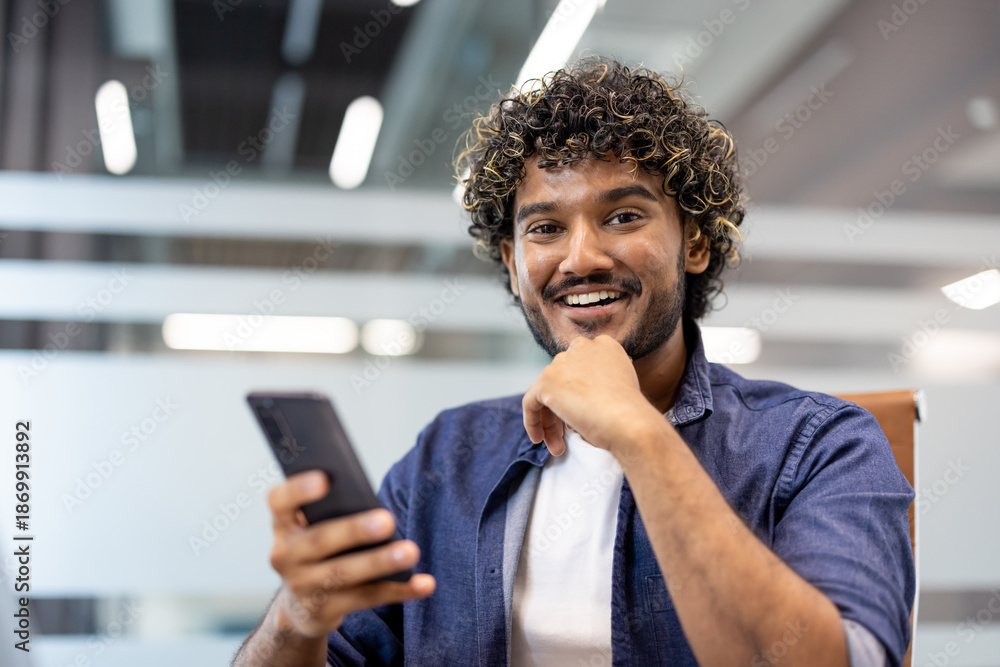 Fototapeta na wymiar - Close-up portrait of a young Indian man sitting in a chair at a desk in an office, holding a phone and smiling at the camera.