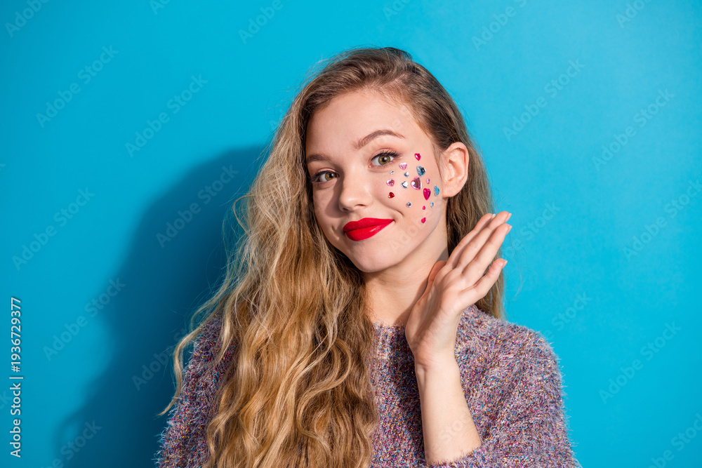 Fototapeta na wymiar - Young stylish woman with glitter makeup posing with hand on blue background wearing a cozy sweater fashion forward and friendly mood.