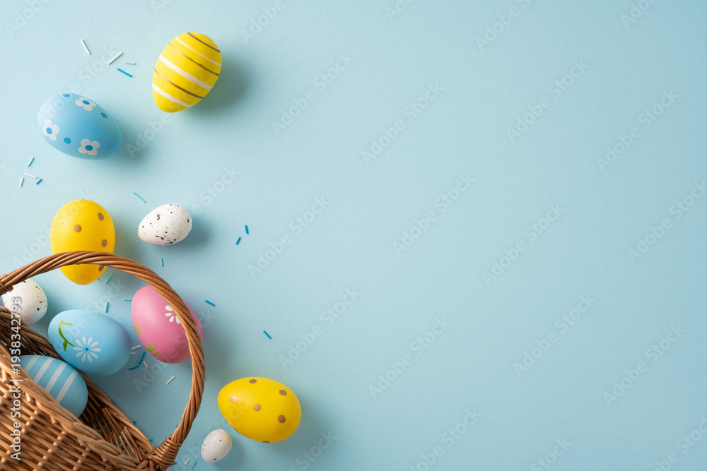 Fototapeta na wymiar - Happy Easter scene featuring colorful decorated eggs spilling from a wicker basket onto a soft pastel blue background with confetti accents and a light festive mood.