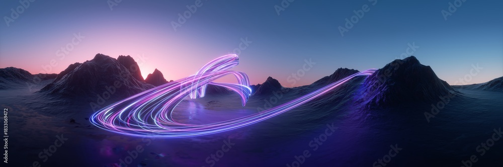 Fototapeta na wymiar - 3d render. Surreal fantasy landscape under the sunset sky. Abstract panoramic background. Rocky mountains and glowing neon dynamic lines in motion..