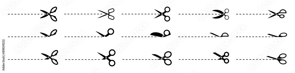 Fototapeta na wymiar - Scissors cutting line icons collection in black. Various open and closed scissor positions with dashed cutting paths.