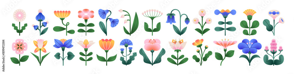 Fototapeta na wymiar - Floral design elements set. Abstract folk style flowers with geometric shapes, delicate petals and leaf. Spring and summer blossoms, nature decor. Flat vector illustration isolated on white background.