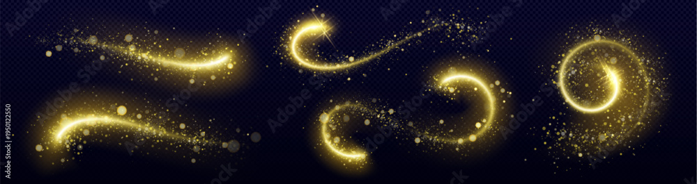 Fototapeta na wymiar - Magical golden glitter trail with sparkling dust particles and glowing star rays, vector swirl effect on dark transparent background. Festive wavy designs elements, shimmering powder.