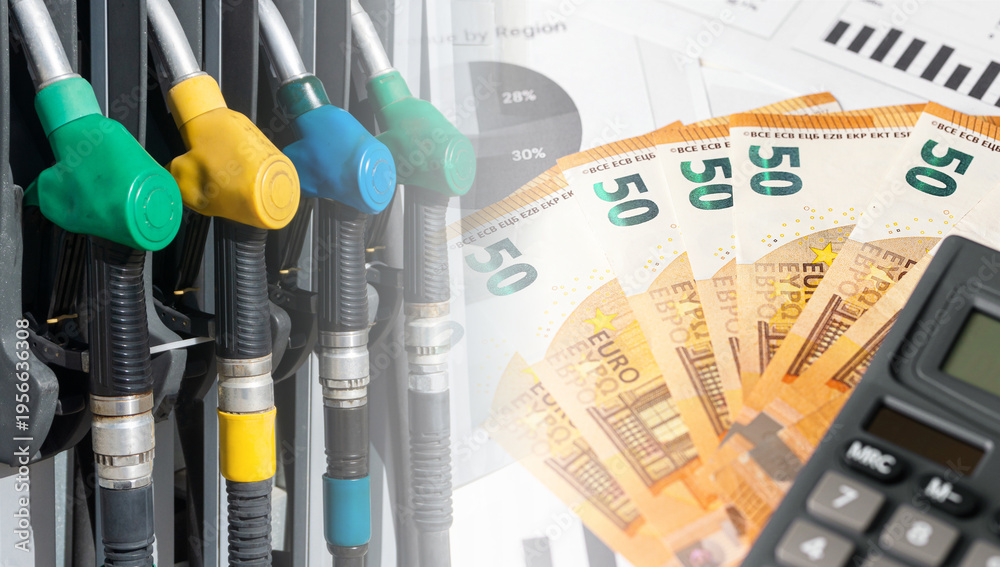 >Fototapety na wymiar>Wybrane motywy - zobacz więcej !>Architektura>Fuel nozzles and euro banknotes. Rising fuel prices concept. Transport costs and energy expenses. Inflation impact on economy and mobility. Financial pressure of refueling and fuel market crisis.