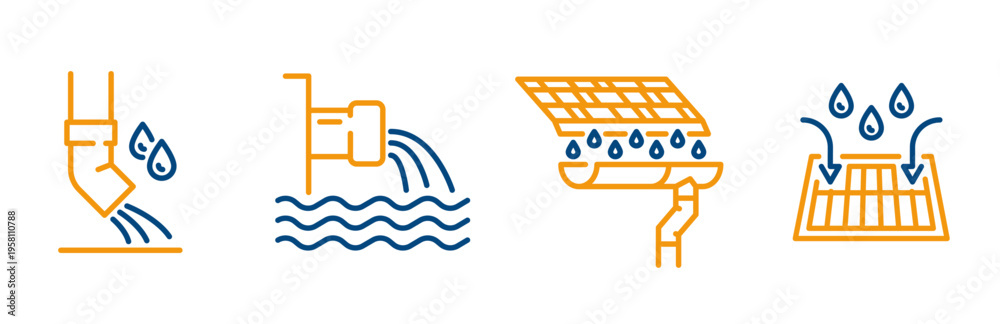 Fototapeta na wymiar - Urban waste drainage icons, set icon of drain water of roof, gutter with rain pipe, street storm sewage, urban sewer drain, outline editable stroke.