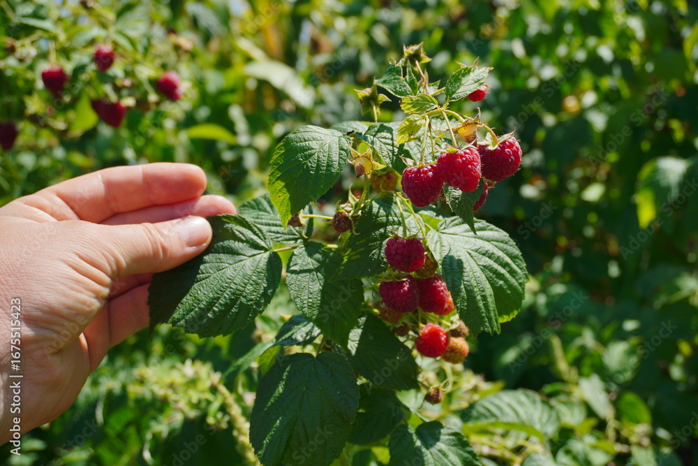 Fototapeta na wymiar - A hand reaches out to gently pick ripe raspberries from a bush in a verdant garden under the warm summer sun, surrounded by vibrant green foliage.