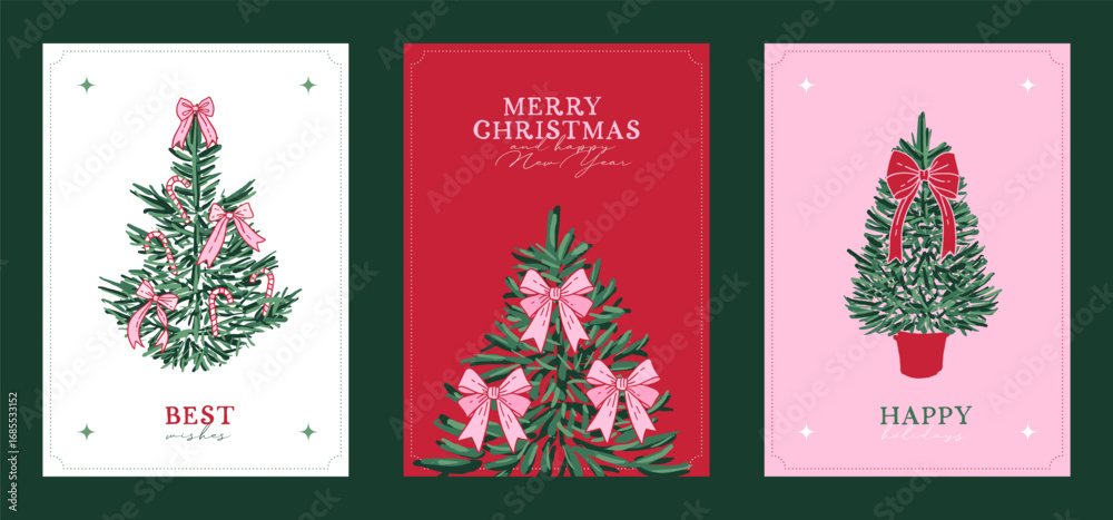 Fototapeta na wymiar - Whimsical Christmas greeting cards templates. Ink drawing Merry Christmas vintage banners set. Xmas design with fit tree with ribbons and bows. Minimalist vector illustration in coquette style..