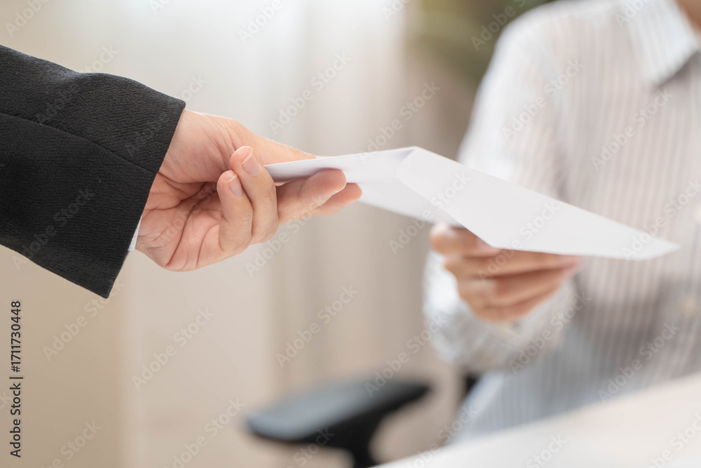 Fototapeta na wymiar - female employee smiling when she receive salary from boss..