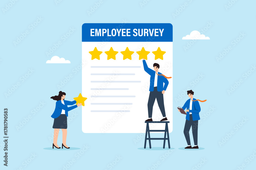 Fototapeta na wymiar - Flat illustration of business team collecting employee survey and customer feedback with five star rating representing performance review engagement and best service experience.
