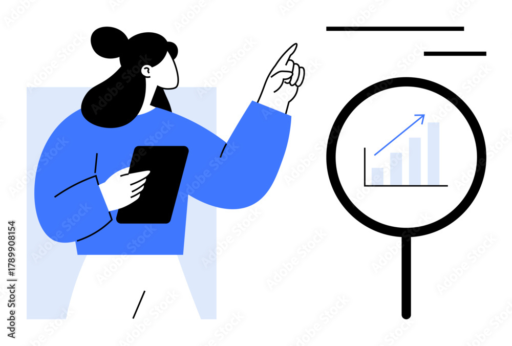 Fototapeta na wymiar - Female character holding tablet and pointing at insights with magnifying glass focusing on growth chart. Ideal for business strategy, analysis, leadership, planning, innovation, education, simple.