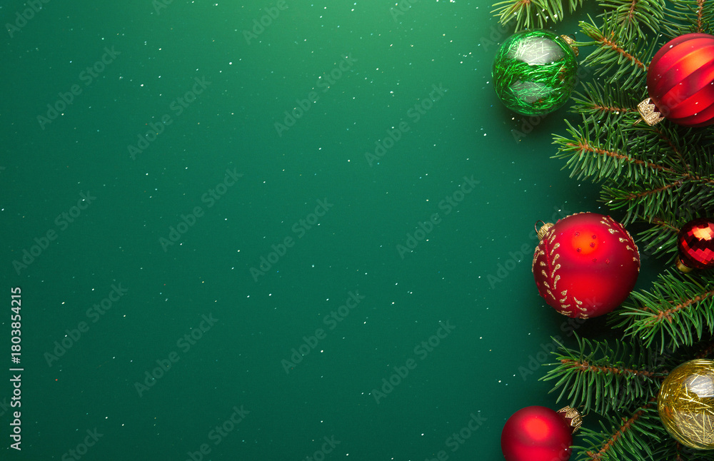 Fototapeta na wymiar - Christmas background with xmas tree, Christmas red decoration and sparkle bokeh lights on green background. Merry Christmas greeting card. Winter holiday theme. Happy New Year. Space for text.