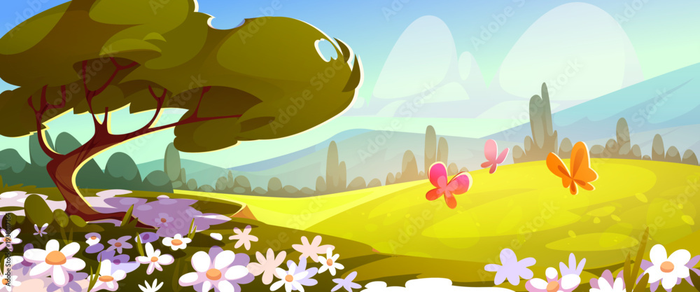 Fototapeta na wymiar - Spring green grass meadow landscape with blooming flowers, forest hills, and flying butterflies, cartoon vector background. Mountains valley with daisies, blue sky, fluffy clouds and golden sunlight.