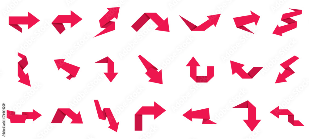 Fototapeta na wymiar - Red arrows. 3D direction pointers. Up, down and left, right origami paper ribbon arrow symbols. Vector isolated set.
