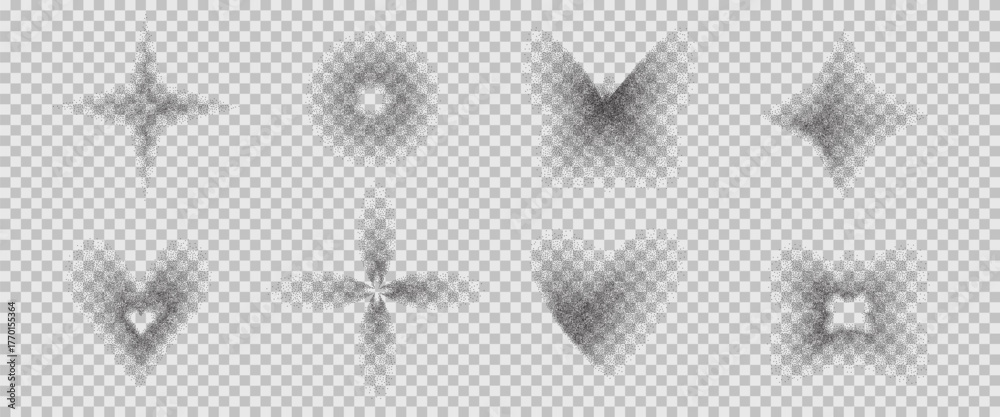 Fototapeta na wymiar - Grain gradient y2k shapes icons. Grainy noise sparkle, flower, butterfly signs set. Simple heart, circle and stars figures. Vector spray gradation figures isolated on transparent background..