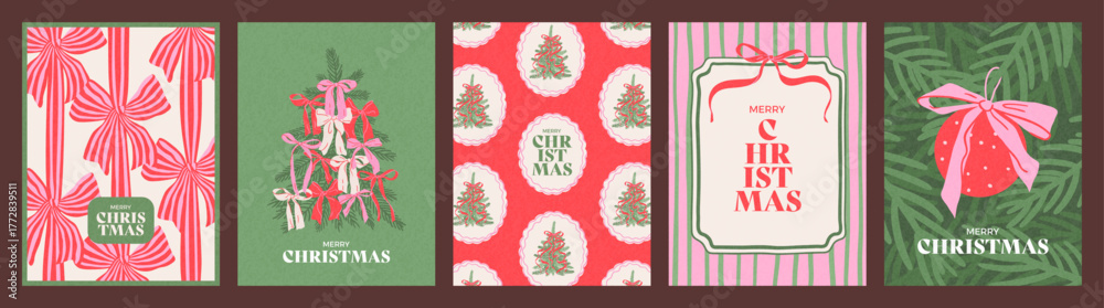 Fototapeta na wymiar - Hand drawn cards set of Merry Christmas and Happy New Year. Vintage concept with gift bows, Christmas tree and ball. Minimalist trendy design for poster, cover, social media, banner, invitation.