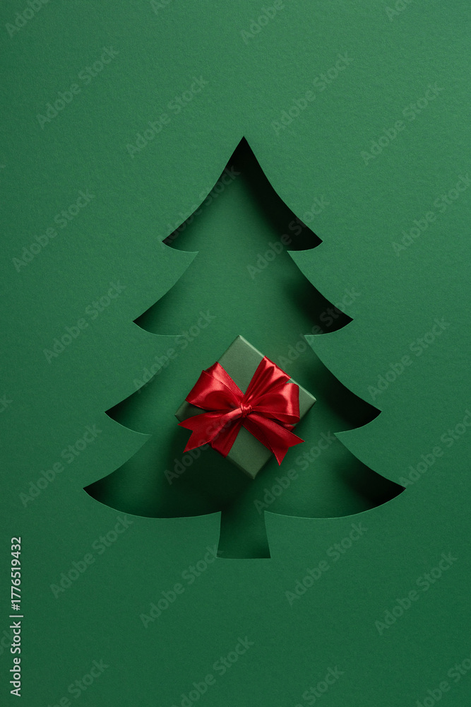 >Fototapety na wymiar>Wybrane motywy - zobacz więcej !>Drzewa>A green holiday card features a layered conifer silhouette with a red ribbon gift at its center, evoking Christmas and New Year greetings, seasonal warmth, and festive decor for seasonal cards