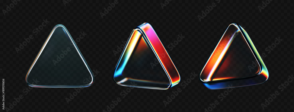 Fototapeta na wymiar - 3D glass triangles with vibrant holographic glow and prism refraction isolated on dark background. Modern geometric elements for digital music interface, y2k futuristic background. 3d vector figure.