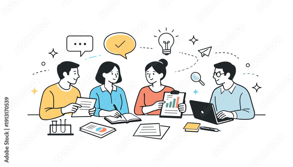 Fototapeta na wymiar - Shared research discussion. A group gathered around a table, comparing notes and results, calm collaboration and mutual focus. Light abstract.