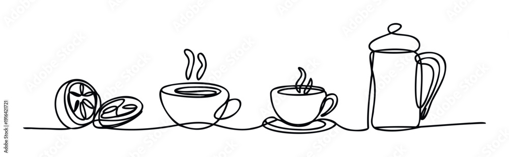 Fototapeta na wymiar - Simple single line drawing depicting warm beverages such as coffee or tea alongside a fresh lemon slice, suitable for food service graphics and drink themed applications..