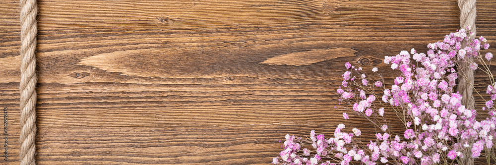 Fototapeta na wymiar - Rustic wooden banner with rope frame and pink flowers, wedding or Valentine greeting background.