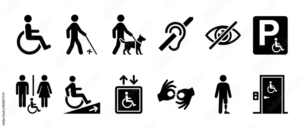 Fototapeta na wymiar - Accessibility icons set featuring various disability symbols for inclusive design, public spaces, and universal access, representing different needs and services..