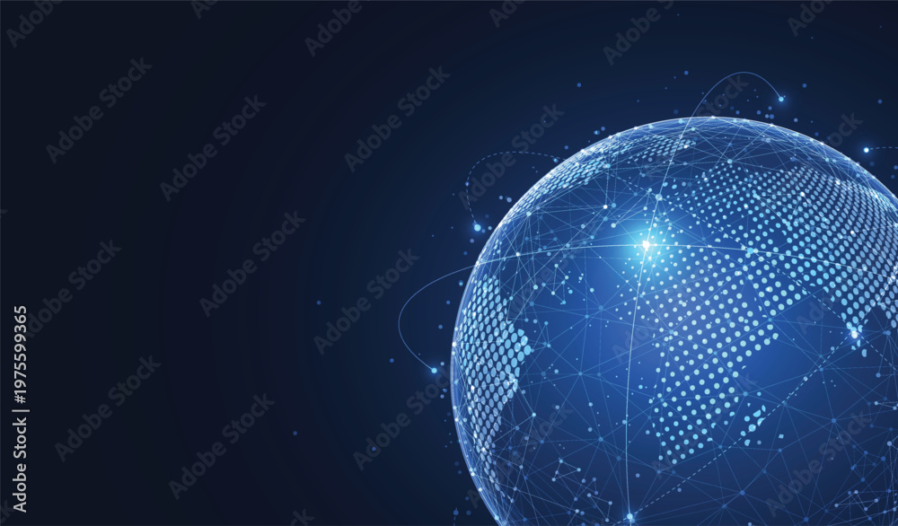 Fototapeta na wymiar - Global digital technology network connection concept with blue glowing globe and copy space..