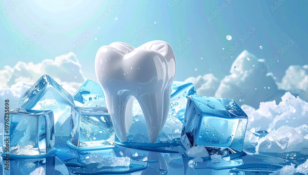 Fototapeta na wymiar - Tooth with ice cubes on blue background.