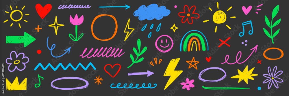 >Fototapety na wymiar>Wybrane motywy - zobacz więcej !>Drzewa>Crayon line icon pastel set. Crayon line icon hand drawn pencil pastel color brush chalk scribble texture. Cute kid children rainbow heart star sun cloud flower baby smile. Vector illustration