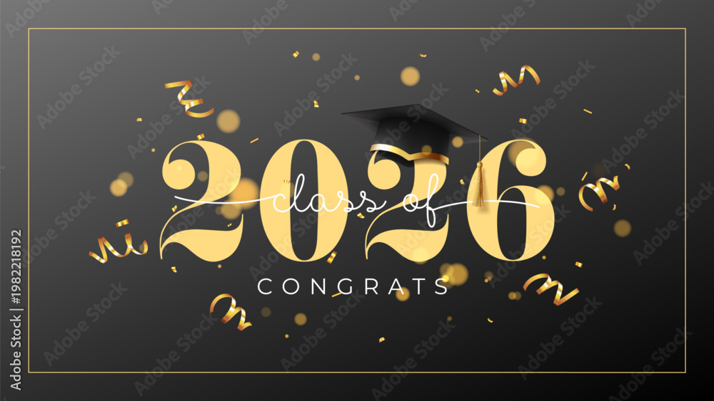 Fototapeta na wymiar - Class of 2026 Concept Banner. Vector background with realistic graduation cap, golden confetti and typography design. Banner for for graduation of college, school, university or degree ceremony..