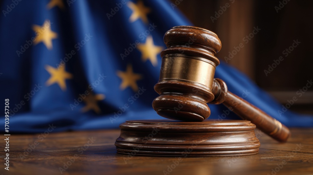 >Fototapety na wymiar>Wybrane motywy - zobacz więcej !>Góry>A wooden gavel is placed on its circular block, symbolizing justice, beside a blue flag representing the European Union, adorned with yellow stars, conveying legislative authority.