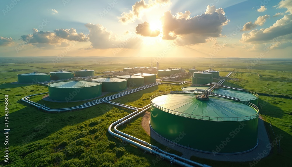 >Fototapety na wymiar>Wybrane motywy - zobacz więcej !>Góry>Large-scale anaerobic digestion plant with pipelines transports biomethane, circular economy in renewable energy. Green tanks store biogas for sustainable fuel production. Industrial facility clean