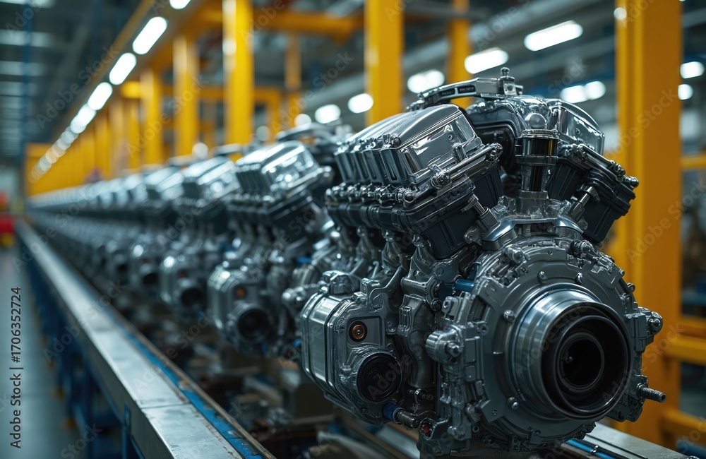 >Fototapety na wymiar>Wybrane motywy - zobacz więcej !>Góry>Automobile engine production line, car parts assembled meticulously in manufacturing facility. Rows of shiny metal engines on assembly conveyor. Industrial workshop setting with machinery,