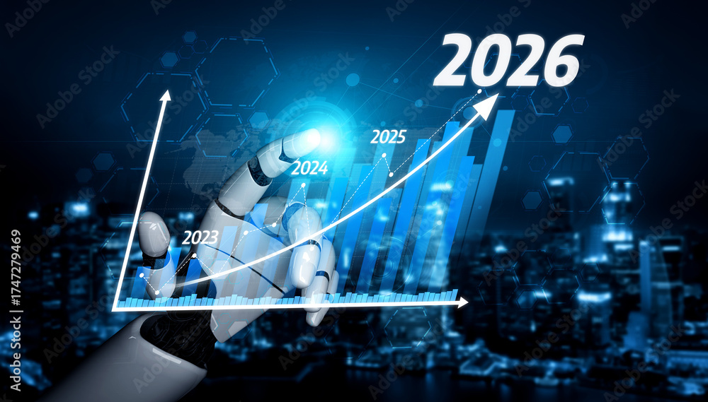 Fototapeta na wymiar - A futuristic robotic hand interacts with a rising growth chart, symbolizing the advancements in technology and data forecasting for the years ahead. Tessel.