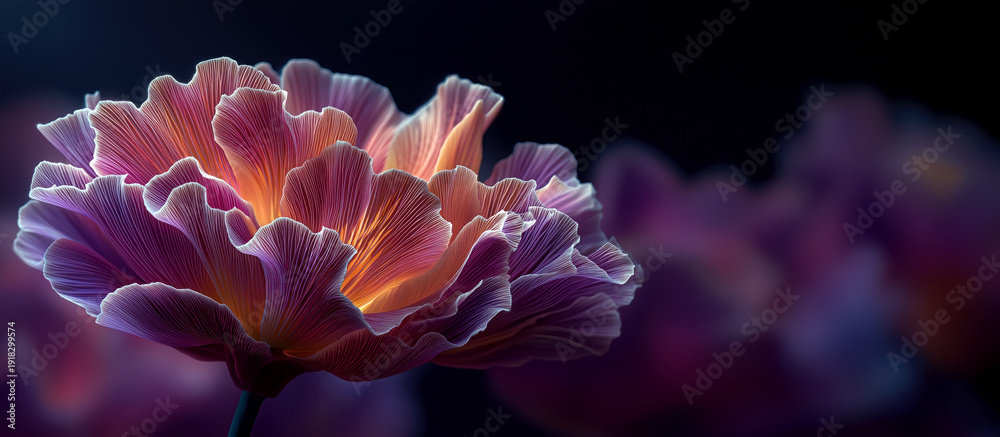 >Fototapety na wymiar>Wybrane motywy - zobacz więcej !>Góry>Purple and orange flower macro with layered petals and dark blurred background. Close up of vibrant blossom with detailed veins and glowing center in soft bokeh light