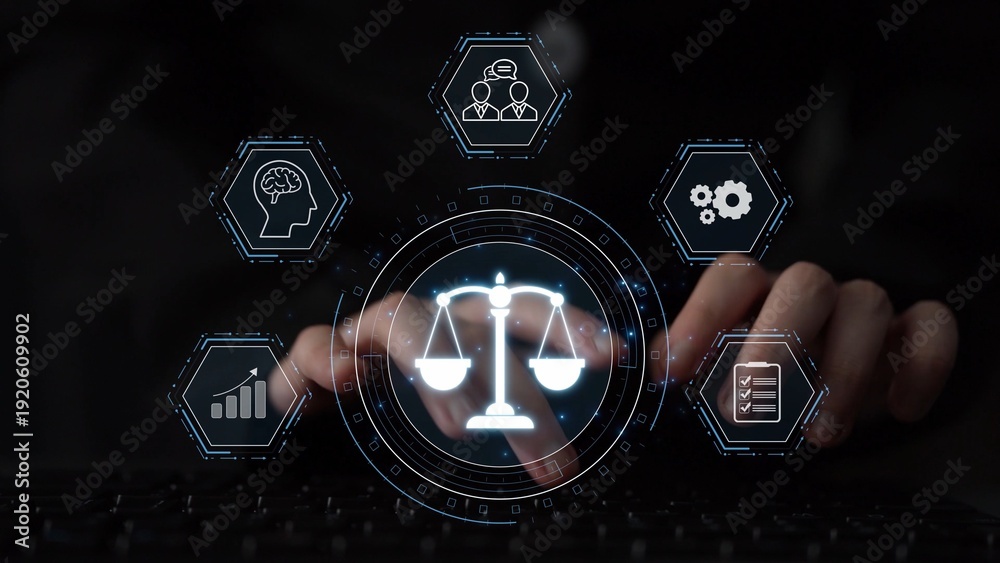Fototapeta na wymiar - Futuristic digital law interface displaying justice scale, highlighting digital law, AI compliance, digital law systems, and digital law regulations for secure governance. Muxer.