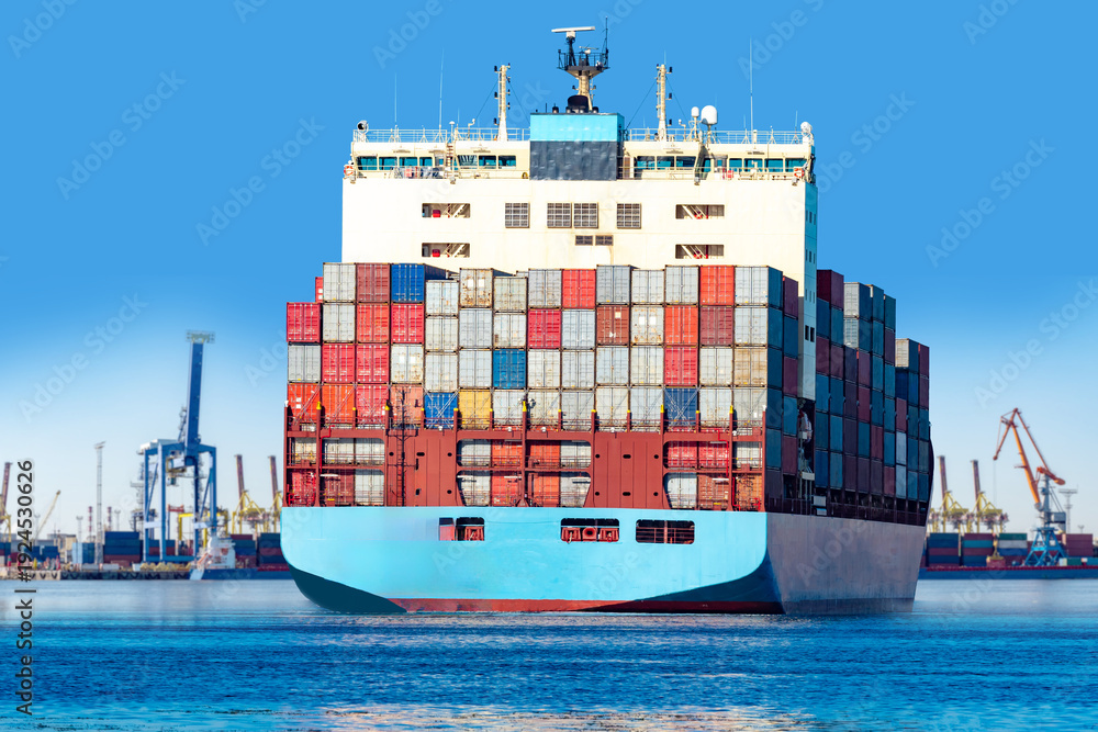 Fototapeta na wymiar - Maritime transport, container shipping. Large cargo ship loaded with stacked containers sails from industrial port, carrying goods for international trade, logistics and global supply chain..