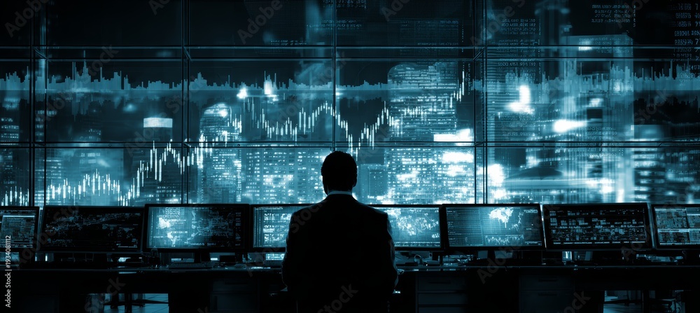 Fototapeta na wymiar - Businessman or stock trader using multiple screen for trading and investment. Generative AI technology. .