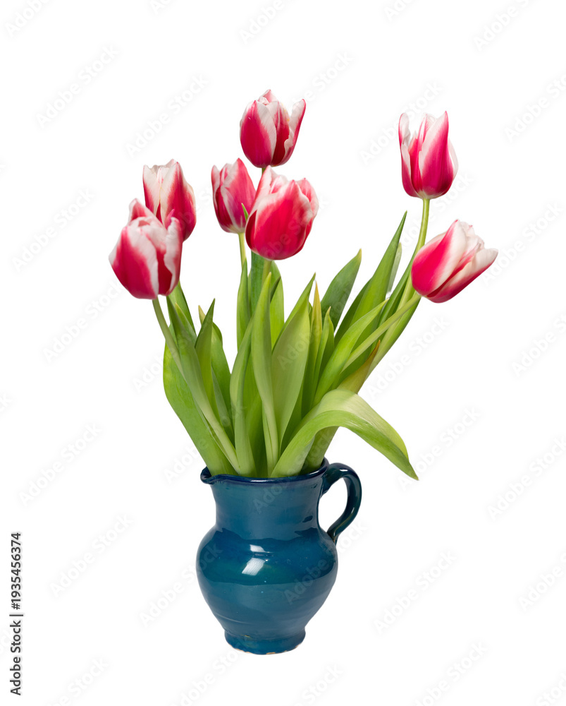Fototapeta na wymiar - A vibrant bouquet of red-and-white tulips in a glossy teal ceramic jug against a clean white background. A bouquet of tulips in blue vase isolated..