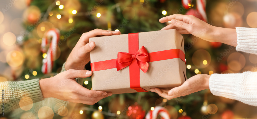 Fototapeta na wymiar - Hands of young man and woman with gift box near Christmas tree at home, closeup.