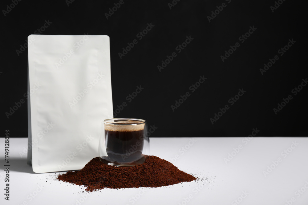Fototapeta na wymiar - Bag with coffee powder and glass of hot espresso on white table.