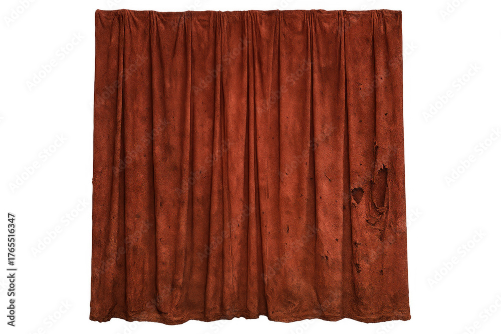 Fototapeta na wymiar - Grungy red curtain with torn fabric showcasing old theater atmosphere, stage backdrop, and horror theme, transparent background.
