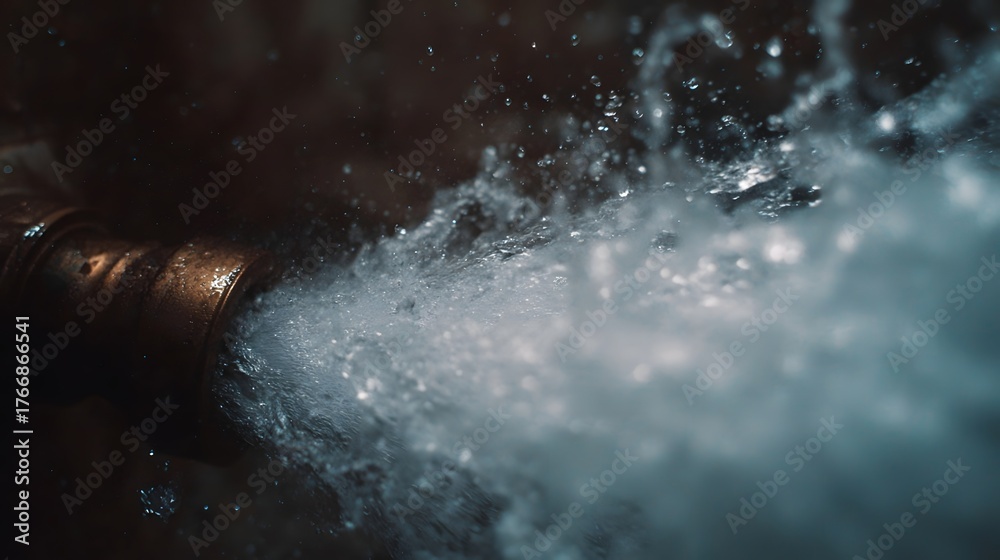Fototapeta na wymiar - A burst pipe sprays water forcefully in a dark industrial setting creating a dynamic splash.