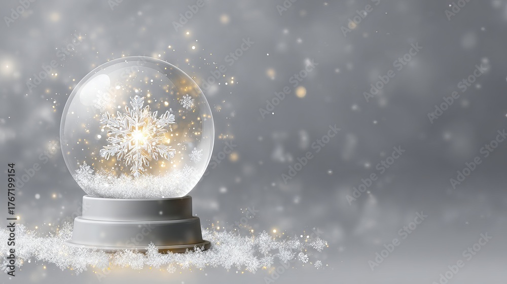 Fototapeta na wymiar - Empty snow globe template vector illustration glass snowball with falling snow and snowflakes on gray base mockup with copy space for lettering winter holiday decoration banner poster card design.