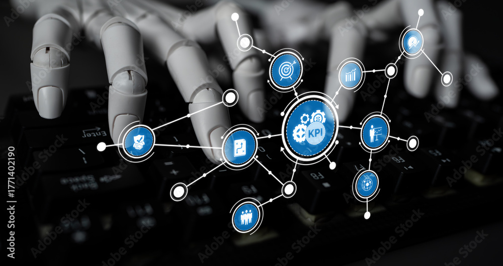 Fototapeta na wymiar - A robotic representation shows hands typing on a keyboard, accompanied by an infographic of KPIs, symbolizing advanced data analysis and innovative technology insights. Tessel.