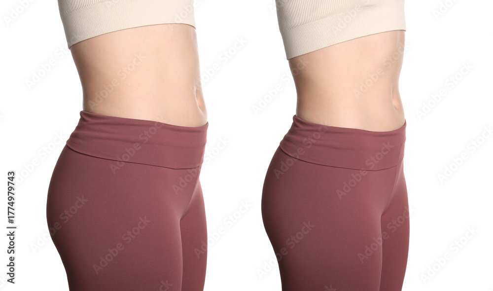 Fototapeta na wymiar - Woman before and after weight loss against white background, closeup. Collage.